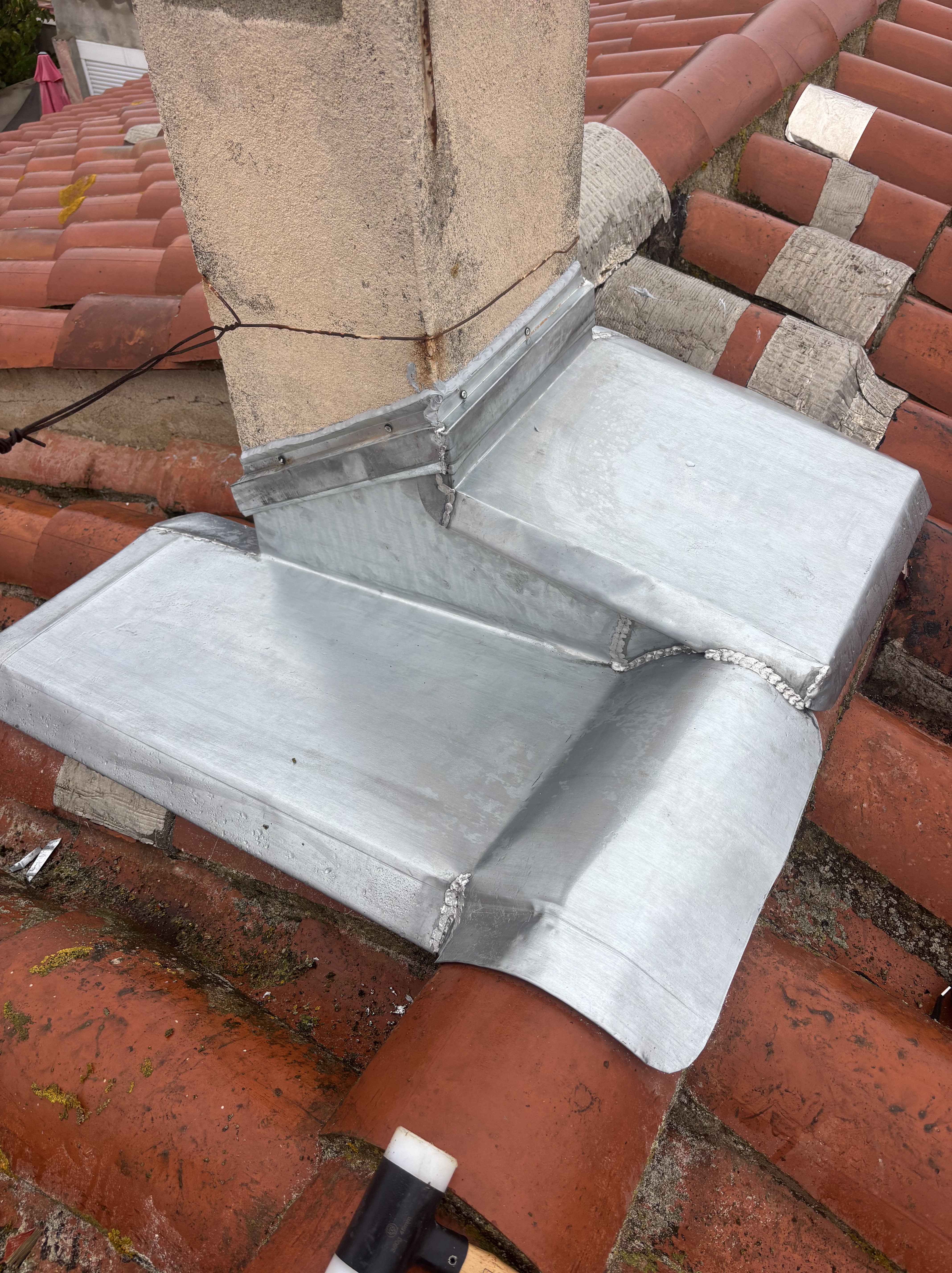 Façonnage, mise en place et soudure d’un chéneau en zinc sur mesure avec les accessoires : porte solin en zinc grillagé et naissance carrée sur mesure.